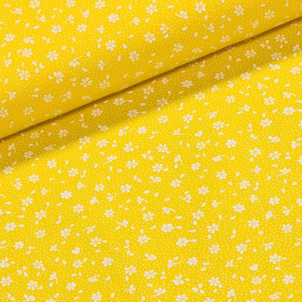 Bavlněná látka (tkanina) s motivem bílých květinek na žluté. Látka je v šířce 160 cm, vyrobena ze 100% bavlny (gramáž 135g/m2) v plátnové vazbě. Vzor látky je natištěn jen z jedné strany z druhé strany je látka bez potisku.