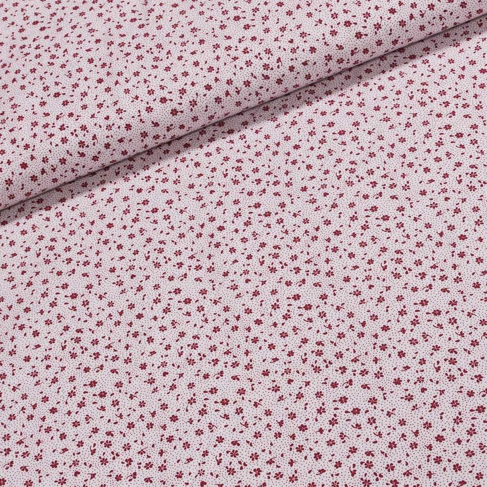 Bavlněná látka (tkanina) s motivem bordó květinek na bílé. Látka je v šířce 160 cm, vyrobena ze 100% bavlny (gramáž 135g/m2) v plátnové vazbě. Vzor látky je natištěn jen z jedné strany z druhé strany je látka bez potisku.
