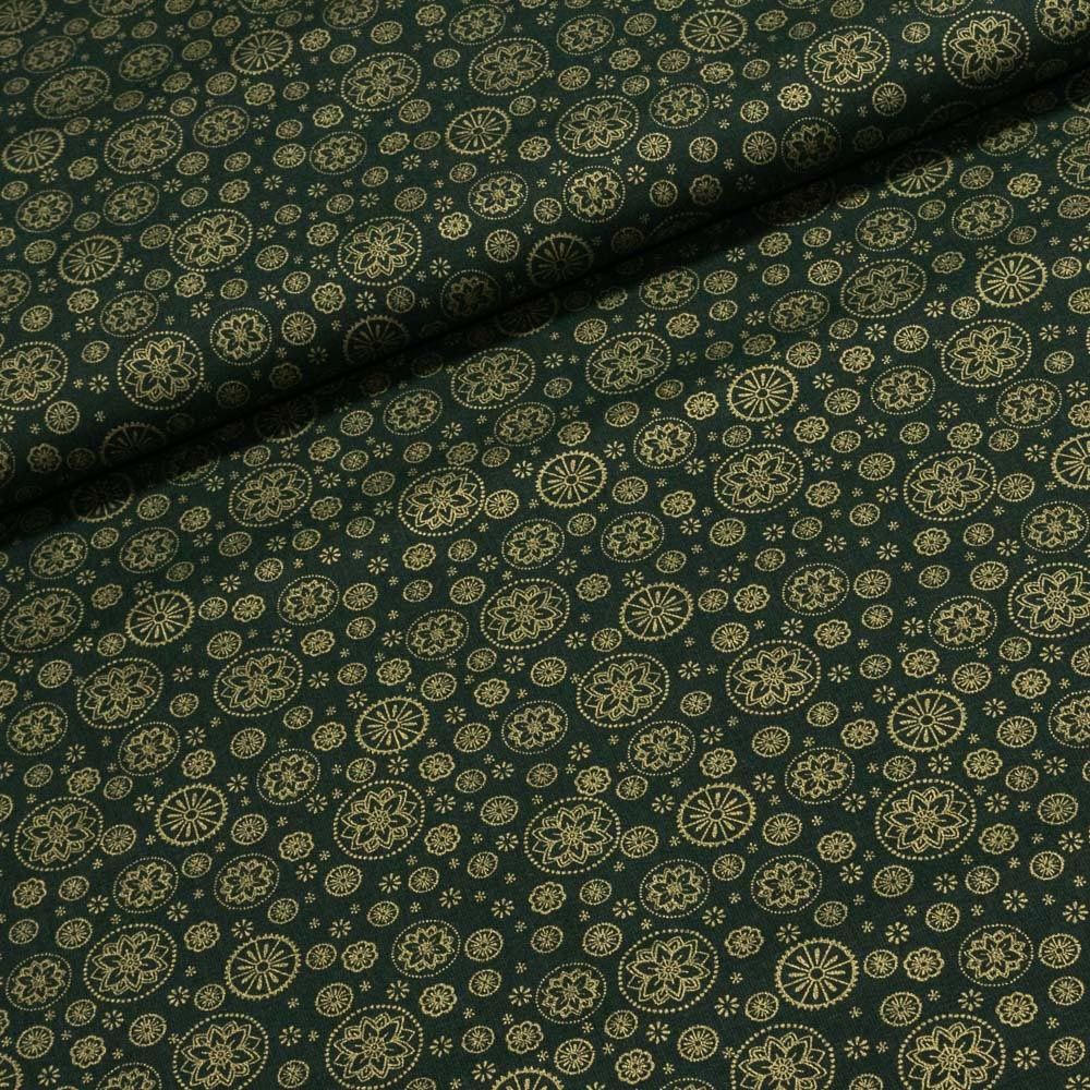 Bavlněné plátno vánoční 2676/1612804/21 zlaté ornamenty na zelené, š.140cm (látka v metráži)