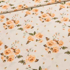 Bavlněný krep s motivem lososových růží na bílém pozadí. Krepová látka je v šířce 160 cm a je vyrobena ze 100% bavlny. Vzor na látce je natištěn jen z jedné strany.