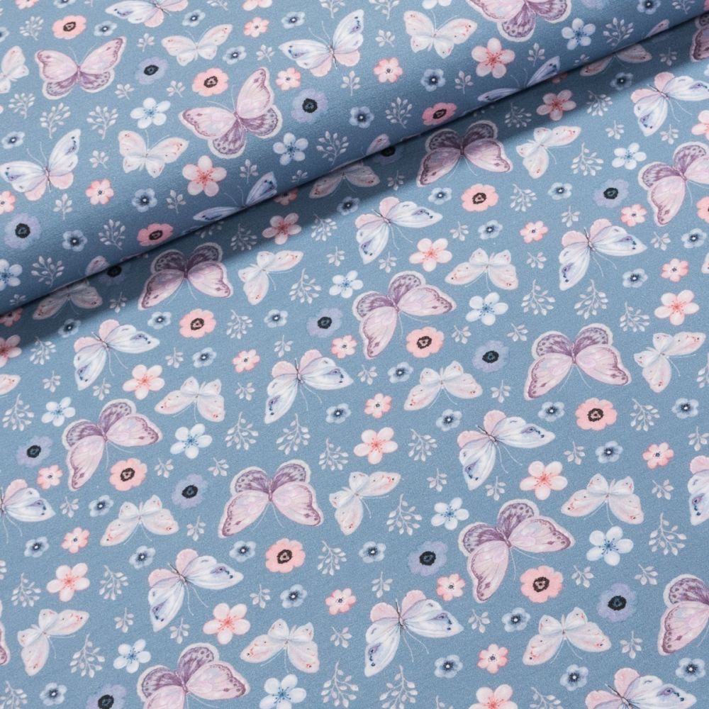 Elastický úplet (jersey) se vzorem růžových motýlů s květinami na modrém podkladu. Úplet je zejména vhodný na trička, elastické kalhoty, kardigany, tepláky, čepice. šaty či kraťasy. Úplet je vyroben z 95% bavlny a 5% elastanu (gramáž 200g/m2) v šířce 150cm. Látka má vzor z jedné strany, z druhé strany je bez potisku.