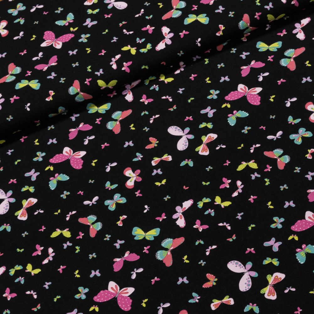 Elastický úplet (jersey) se vzorem růžových a tyrkysových motýlků na černém podkladu. Úplet je zejména vhodný na trička, tepláky, elasťáky, mikiny, šaty, kraťasy či čepice. Látka je v šířce 150 cm, vyrobena z 95% bavlny a 5% elastanu (gramáž 200g/m2). Látka je jednolícní.