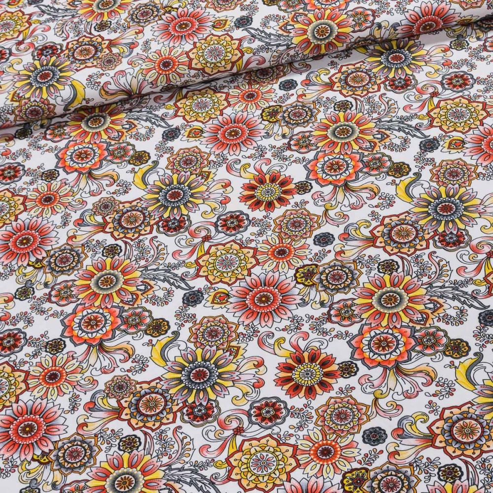 Elastický úplet (jersey) se vzorem květinových mandal převážně v červené barvě na bílém podkladu, který je vhodný zejména na trička, mikiny, tepláky, elasťáky či kraťasy. Látka je v šířce 180 cm, vyrobena z 95% bavlny a 5% elastanu (gramáž 200g/m2). Látka má vzor z jedné strany z druhé strany je bez potisku..