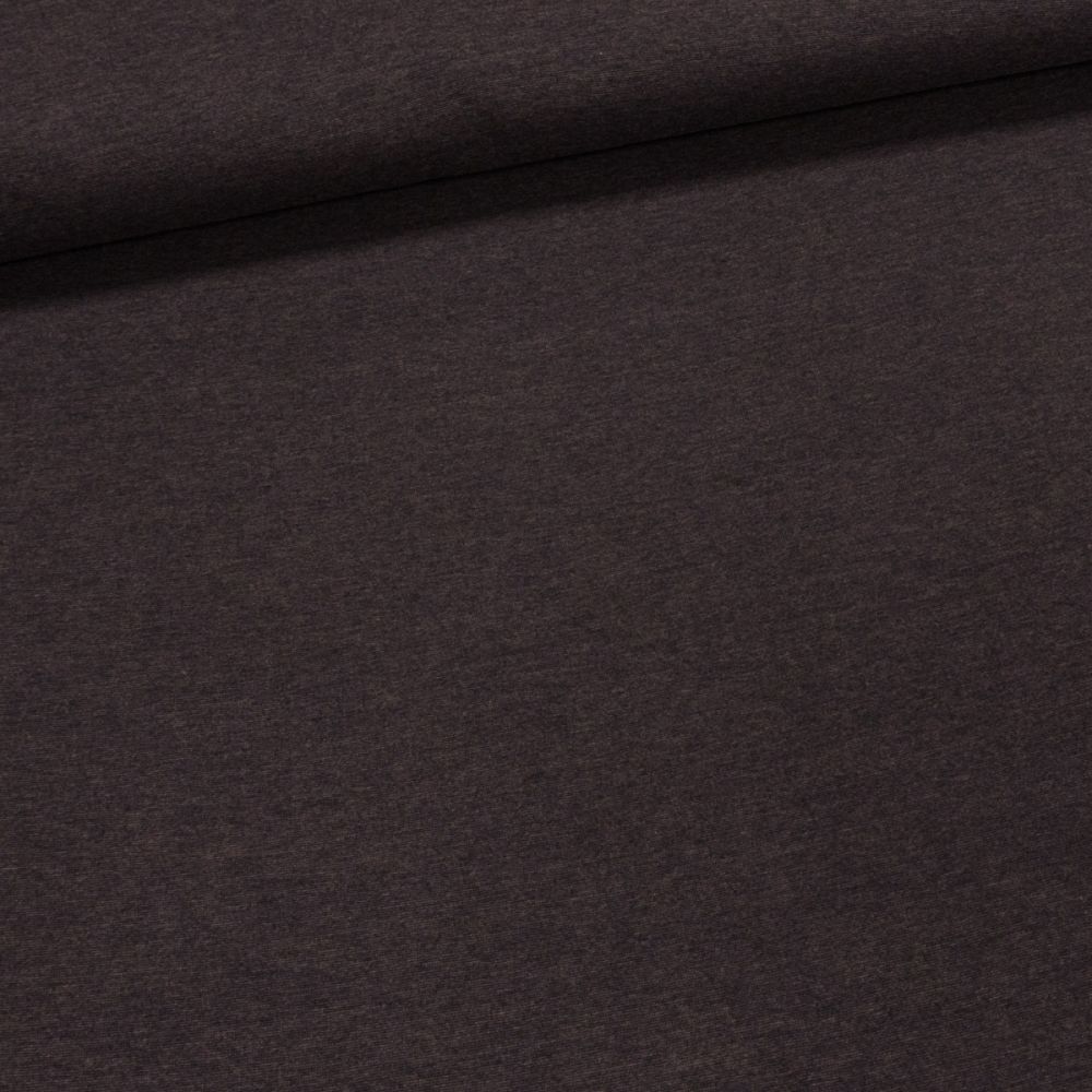 Elastický úplet (jersey) se vzorem tmavě hnědého melíru, který je vhodný na trička, mikiny, tepláky, elasťáky, šaty, sukně, kardigany. Látka je v šířce 175 cm, vyrobena z 95% bavlny a 5% elastanu (gramáž 230g/m2). Látka z obou stran stejná.
