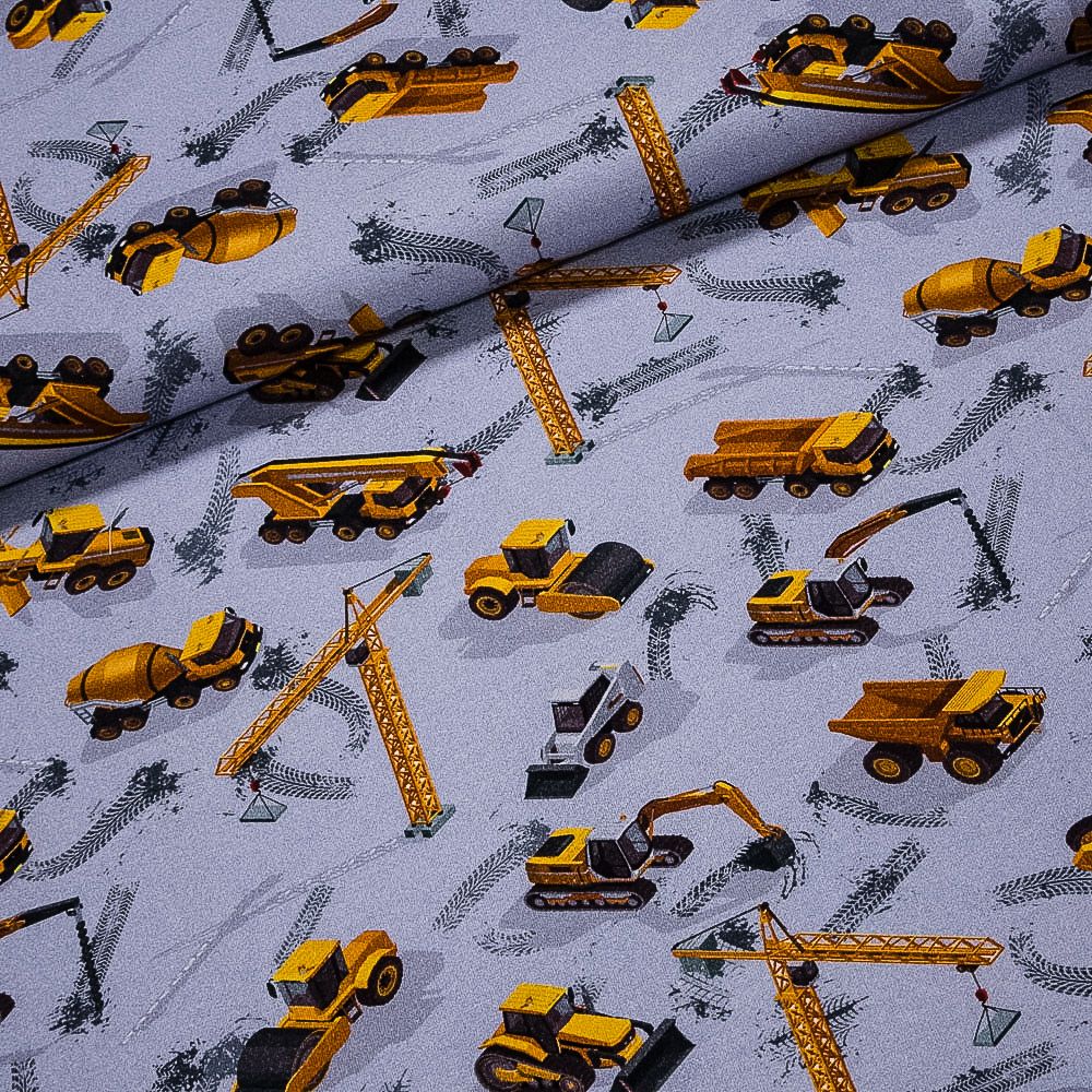 Bavlněný úplet dětský 6-07621 DIGITÁLNÍ TISK žluté stavební stroje na šedé, š.180cm (látka v metráži)