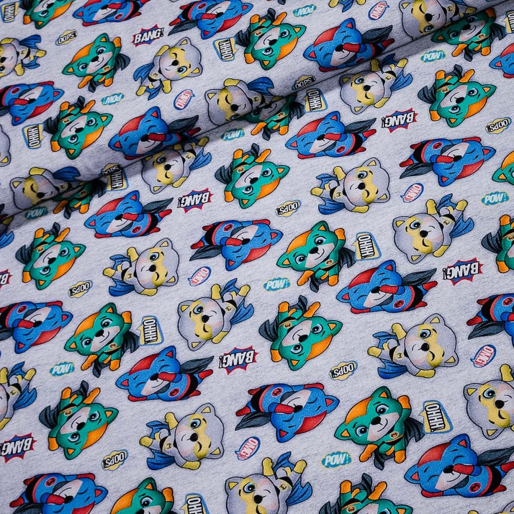 Elastický bavlněný úplet (jersey) se vzorem komiksových létajících medvídků na světle šedém podkladu. Úplet je zejména vhodný na šaty, halenky, kardigany či sukně. Látka je v šířce 155 cm a je vyrobena z 95% bavlny a 5% elastanu (200g/m2). Látka má vzor z jedné strany z druhé strany je bez potisku.
