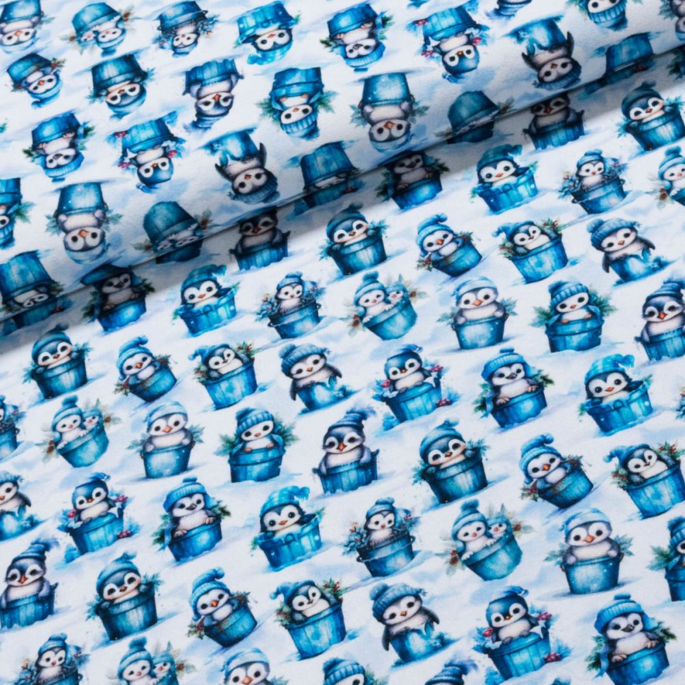 Bavlněný úplet dětský 6-23123 DIGITÁLNÍ TISK tučňáci v kyblíku, modrá, š.150cm (látka v metráži)