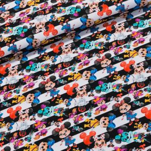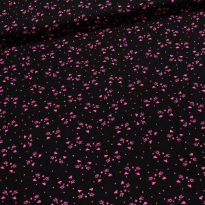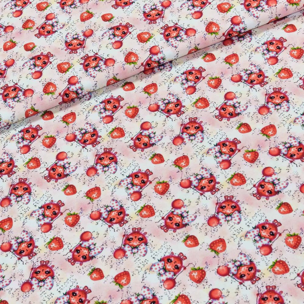 Elastický bavlněný úplet (jersey) se vzorem červených jahůdek s mašličkami a balonky na bílém podkladu. Látka je v šířce 142 cm, vyrobena z 95% bavlny a 5% elastanu (gramáž 200g/m2). Úplet je vhodný zejména na mikiny, kalhoty, sukně, topy, tuniky, kardigany či tepláky. Látka má vzor z jedné strany, z druhé strany je bez potisku.