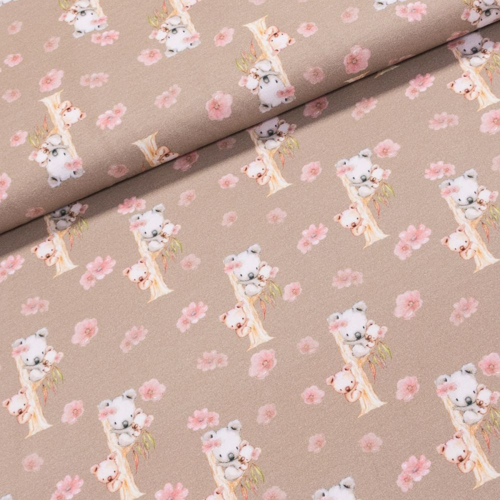 Elastický úplet (jersey) se vzorem koaly s mláďaty na stromě na béžovém podkladu s růžovými květinami. Úplet je zejména vhodný na trička, tepláky, elasťáky, mikiny, šaty, kraťasy či čepice. Látka je v šířce 142 cm, vyrobena z 95% bavlny a 5% elastanu (gramáž 200g/m2). Látka je jednolícní.