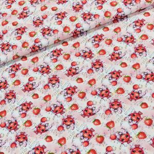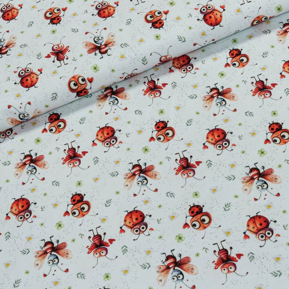 Elastický úplet (jersey) se vzorem berušek na bílém podkladu s květinkami, který je vhodný na trička, mikiny, tepláky, elasťáky, šaty, sukně, kardigany. Látka je v šířce 142 cm, vyrobena z 95% bavlny a 5% elastanu (gramáž 200g/m2). Látka má vzor jen z jedné strany, z druhé strany je bez potisku.