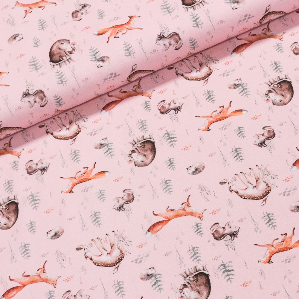 Elastický úplet (jersey) se vzorem lišky, medvěda, zajíce a srnce na růžovém pozadí. Úplet je zejména vhodný na tepláky, mikiny, čepice či nákrčníky. Látka je v šířce 145cm, vyrobena z 95% bavlny a 5% elastanu (gramáž 240g/m2). Látka je jednolícní.