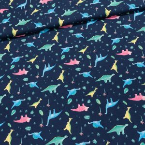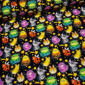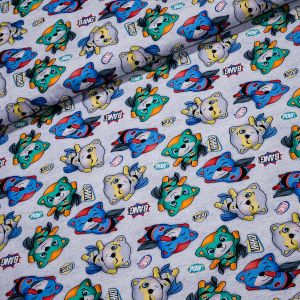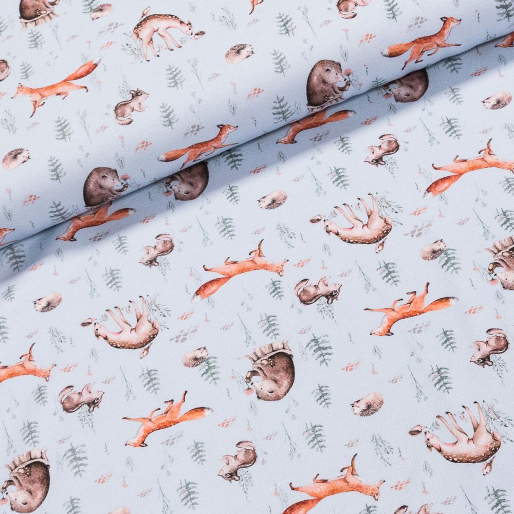 Elastický úplet (jersey) se vzorem lišky, medvěda, zajíce a srnce na šedo-modrém pozadí. Úplet je zejména vhodný na tepláky, mikiny, čepice či nákrčníky. Látka je v šířce 145cm, vyrobena z 95% bavlny a 5% elastanu (gramáž 240g/m2). Látka je jednolícní.