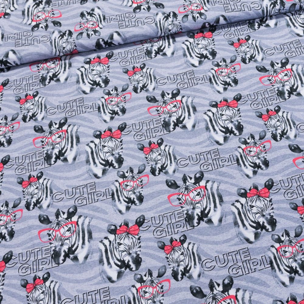 Elastický úplet (jersey) se vzorem zeber s růžovou mašlí a brýlemi na šedém pozadí s nápisy. Úplet je zejména vhodný na tepláky, šaty, nákrčníky, elasťáky či mikiny. Látka je v šířce 150 cm, vyrobena z 95% bavlny a 5% elastanu (gramáž 240g/m2). Látka má vzor jen z jedné strany z druhé strany je bez potisku.