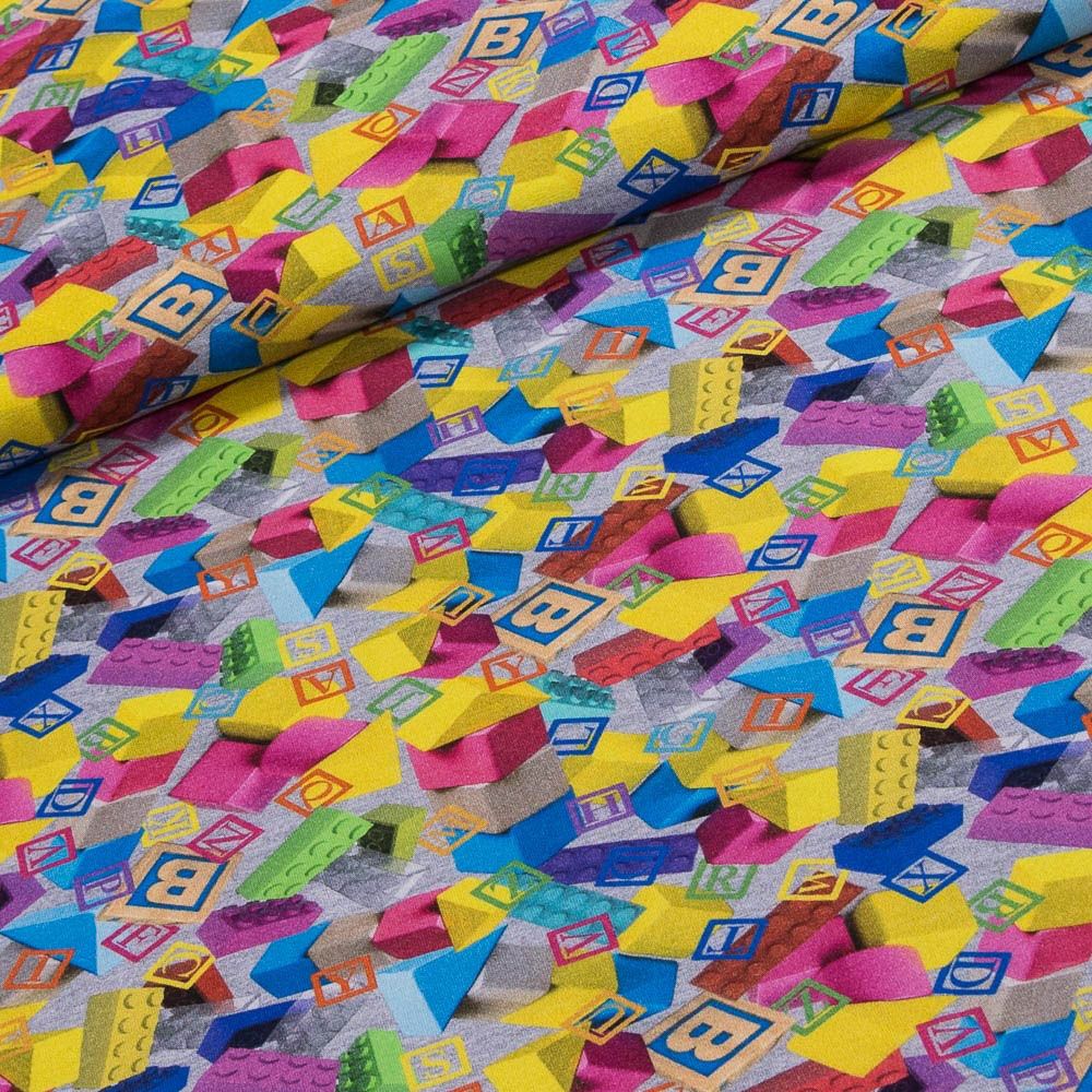 Elastický úplet (jersey) s motivem barevných kostek ze stavebnice lego. Látka je v šířce 180 cm, vyrobena z 95% bavlny a 5% elastanu (gramáž 200g/m2). Vzor látky je natištěn jen z jedné strany z druhé strany je látka bez potisku.