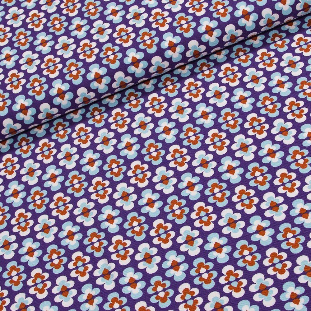Elastický úplet (jersey) s motivem modrých květin na fialovém pozadí z kolekce Tante Ema. Látka je v šířce 150 cm, vyrobena z 95% bavlny a 5% elastanu (gramáž 220g/m2). Vzor látky je natištěn jen z jedné strany z druhé strany je látka bez potisku.