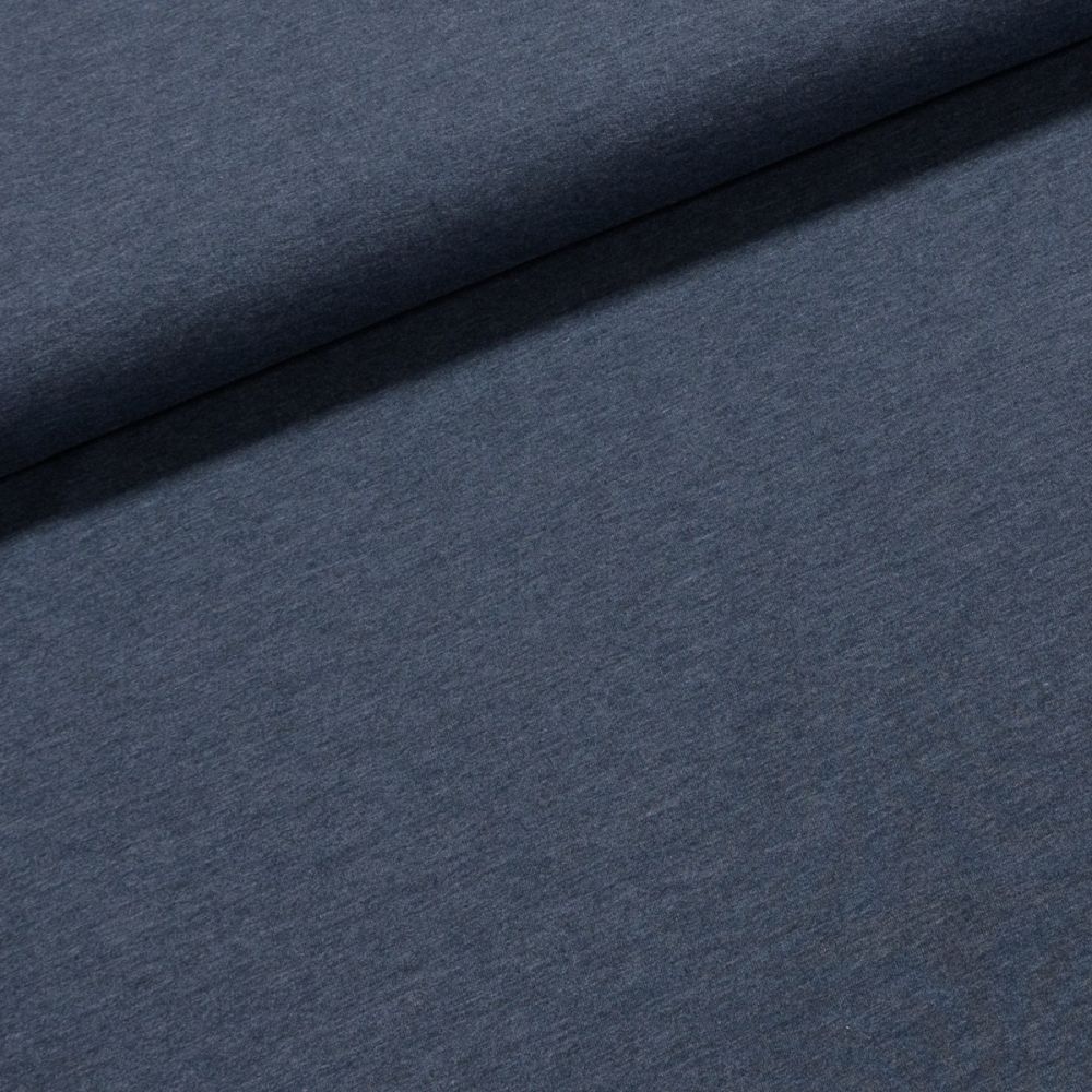 Elastický bavlněný úplet (jersey) s melírem v modré barvě. Je vyroben z 95% bavlny a 5% elastanu (gramáž 250g/m2). Látka je v šířce 150 cm, je vhodná na výrobu mikin, tepláků, nákrčníků, čepic či šatů.