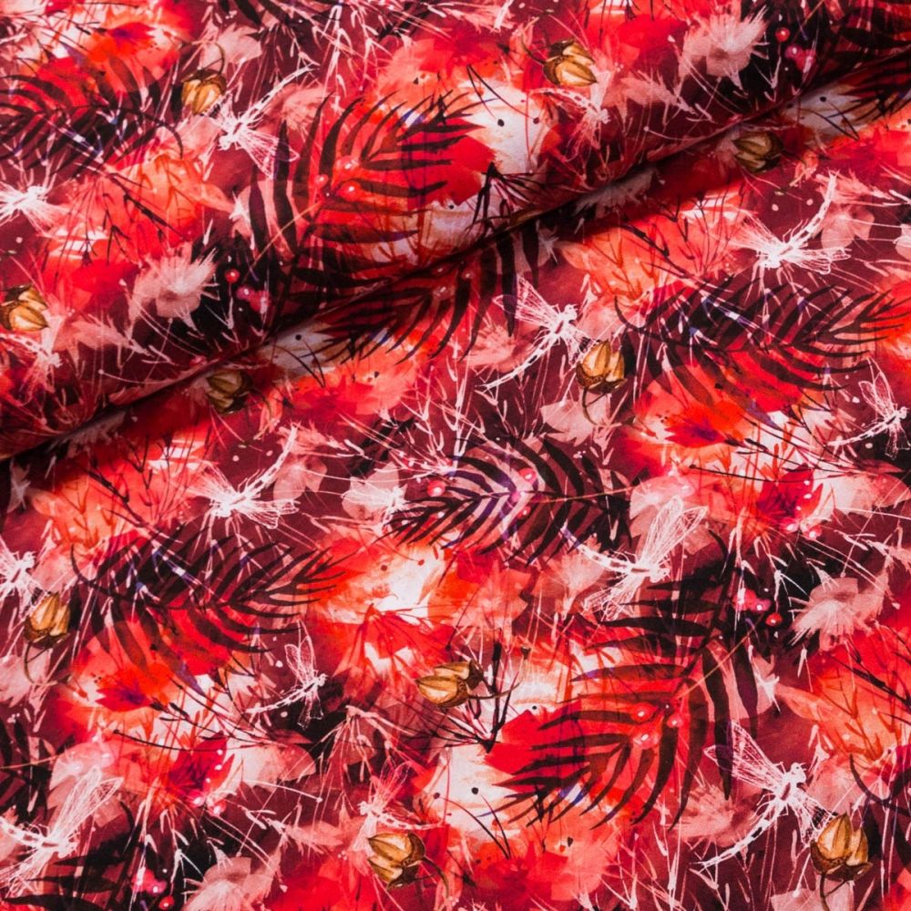 Elastický úplet (jersey) se vzorem listí na červeném pozadí. Látka je v šířce 180cm, vyrobena ze 95% bavlny a 5% elastanu (gramáž 250g/m2). Látka je vhodná na tepláky, mikiny, čepice či nákrčníky. Látka má vzor z jedné strany z druhé je bez potisku.