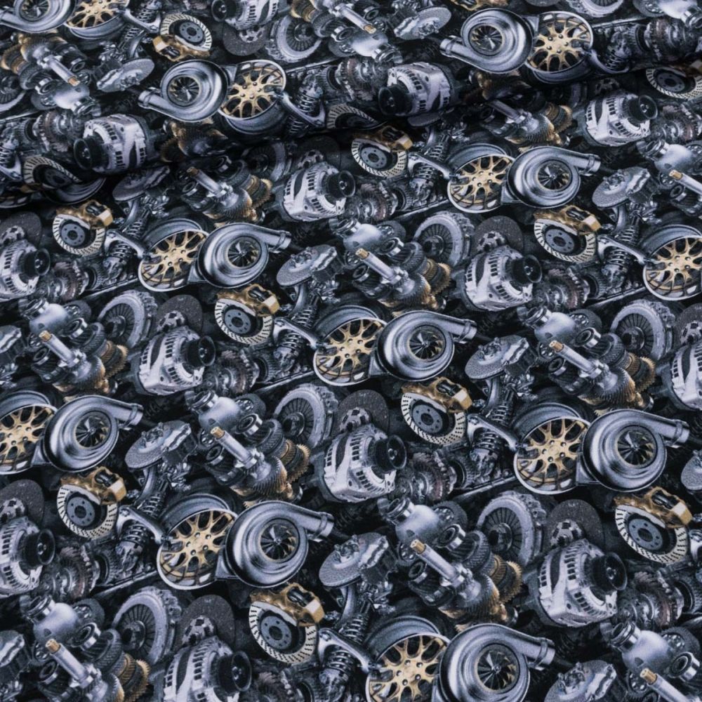 Elastický úplet (jersey) se vzorem automobilových částí a součástek v šedých barvách. Látka je v šířce 150 cm, vyrobena ze 95% bavlny a 5% elastanu (gramáž 230g/m2). Látka je vhodná na tepláky, elasťáky, šaty, sukně, mikiny, čepice či nákrčníky. Látka má vzor z jedné strany z druhé strany je bez potisku.