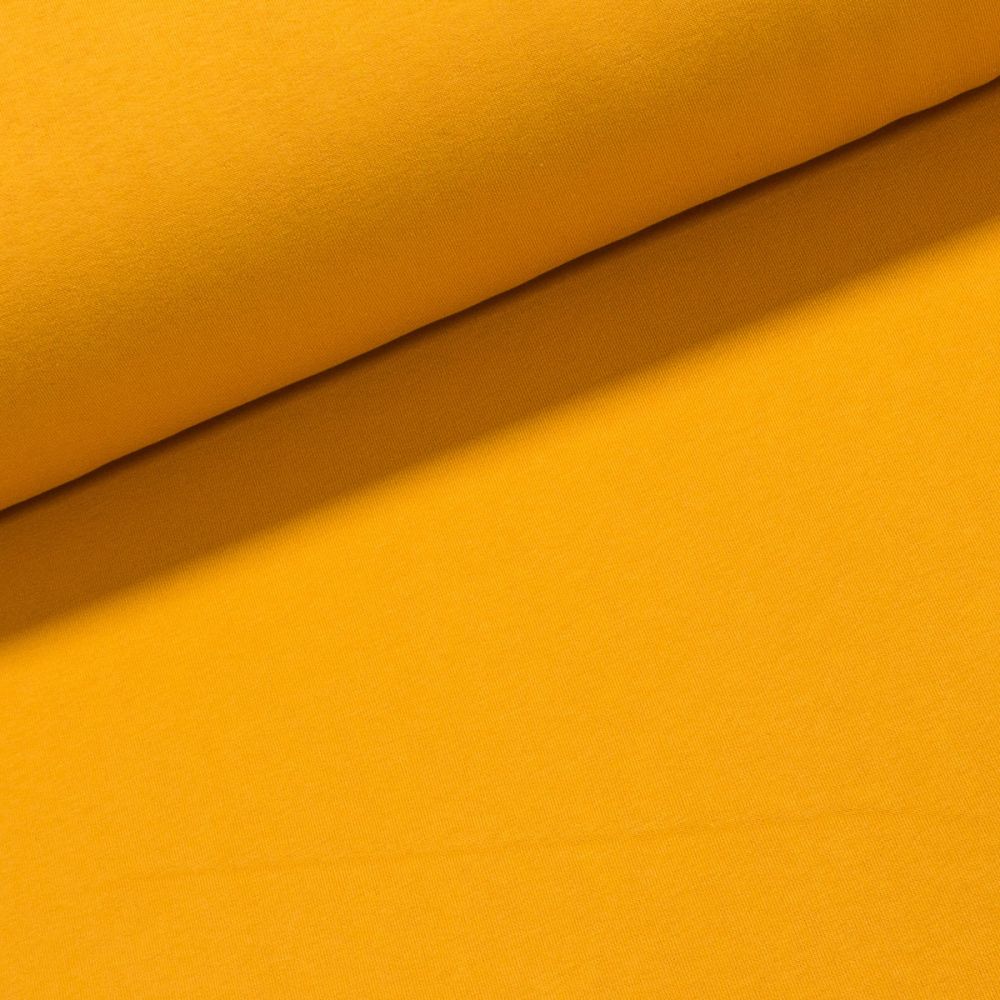 Elastický bavlněný úplet teplákovina (jersey) v jednobarevné hořčicové barvě. Je vyroben z 80% bavlny a 20% polyester (gramáž 240g/m2). Látka je v šířce 180 cm, je vhodná na výrobu mikin, tepláků, nákrčníků, čepic či šatů. Látka je z rubové strany počesaná do jemného chloupku, proto je vhodná na chladné období.