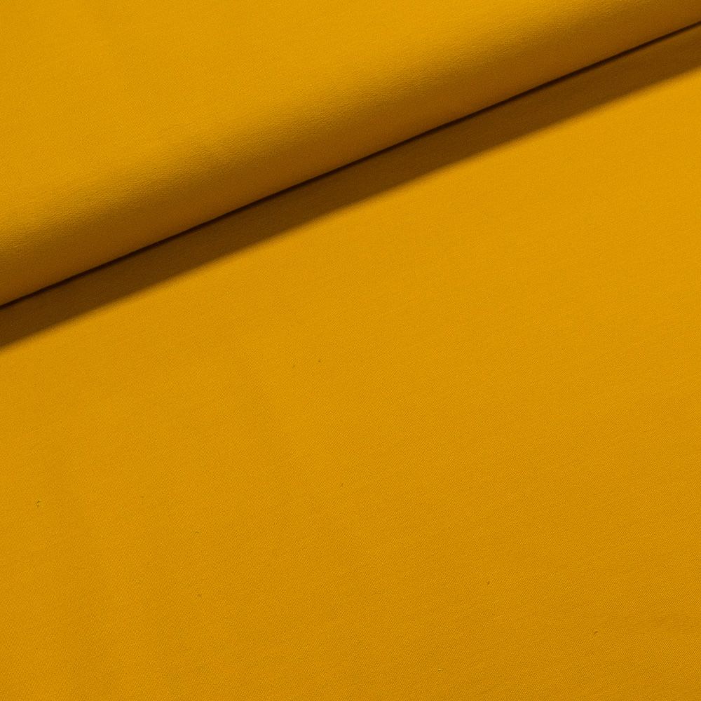 Elastický úplet teplákovina (jersey) v jednobarevné hořčicové barvě. Je vyroben z 90% bavlny a 10% elastanu (gramáž 220g/m2). Látka je v šířce 180 cm. Úplet je zejména vhodný na trička, tepláky, nákrčníky či čepice