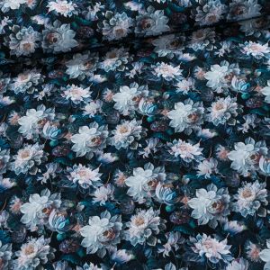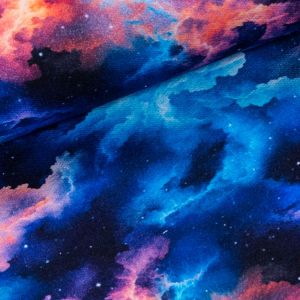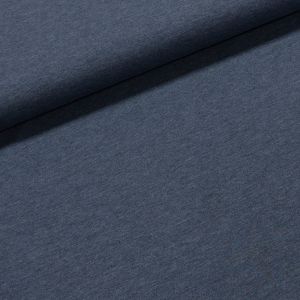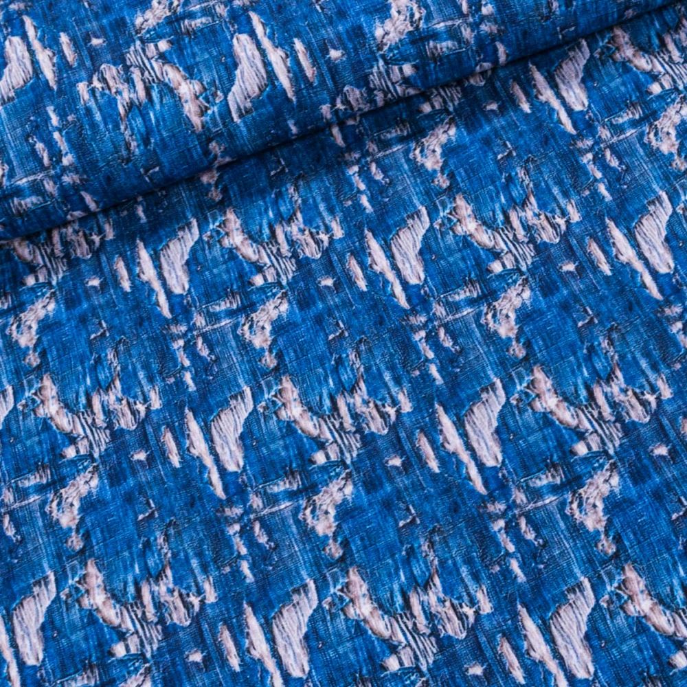 Elastický úplet (jersey) se vzorem roztrhané rifloviny v modré barvě. Látka je v šířce 140 cm, vyrobena ze 95% bavlny a 5% elastanu (gramáž 250g/m2). Látka je vhodná na tepláky, elasťáky, šaty, sukně, mikiny, čepice či nákrčníky. Látka má vzor z jedné strany z druhé strany je bez potisku.