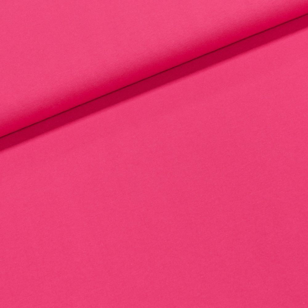 Elastický bavlněný úplet (jersey) v jednobarevné sytě růžové barvě. Je vyroben z 95% bavlny a 5% elastanu (gramáž 240g/m2). Látka je v šířce 180 cm, je vhodná na výrobu mikin, tepláků, nákrčníků, čepic či šatů a je z obou stran stejná.