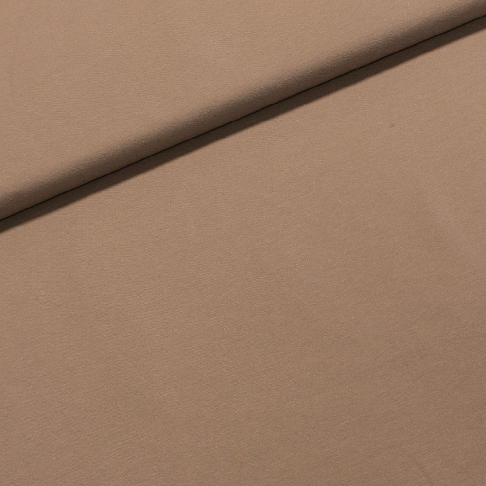 Elastický bavlněný úplet (jersey) v jednobarevné světle hnědé barvě. Je vyroben z 95% bavlny a 5% elastanu (gramáž 250g/m2). Látka je v šířce 150 cm, je vhodná na výrobu mikin, tepláků, nákrčníků, čepic či šatů a je z obou stran stejná.