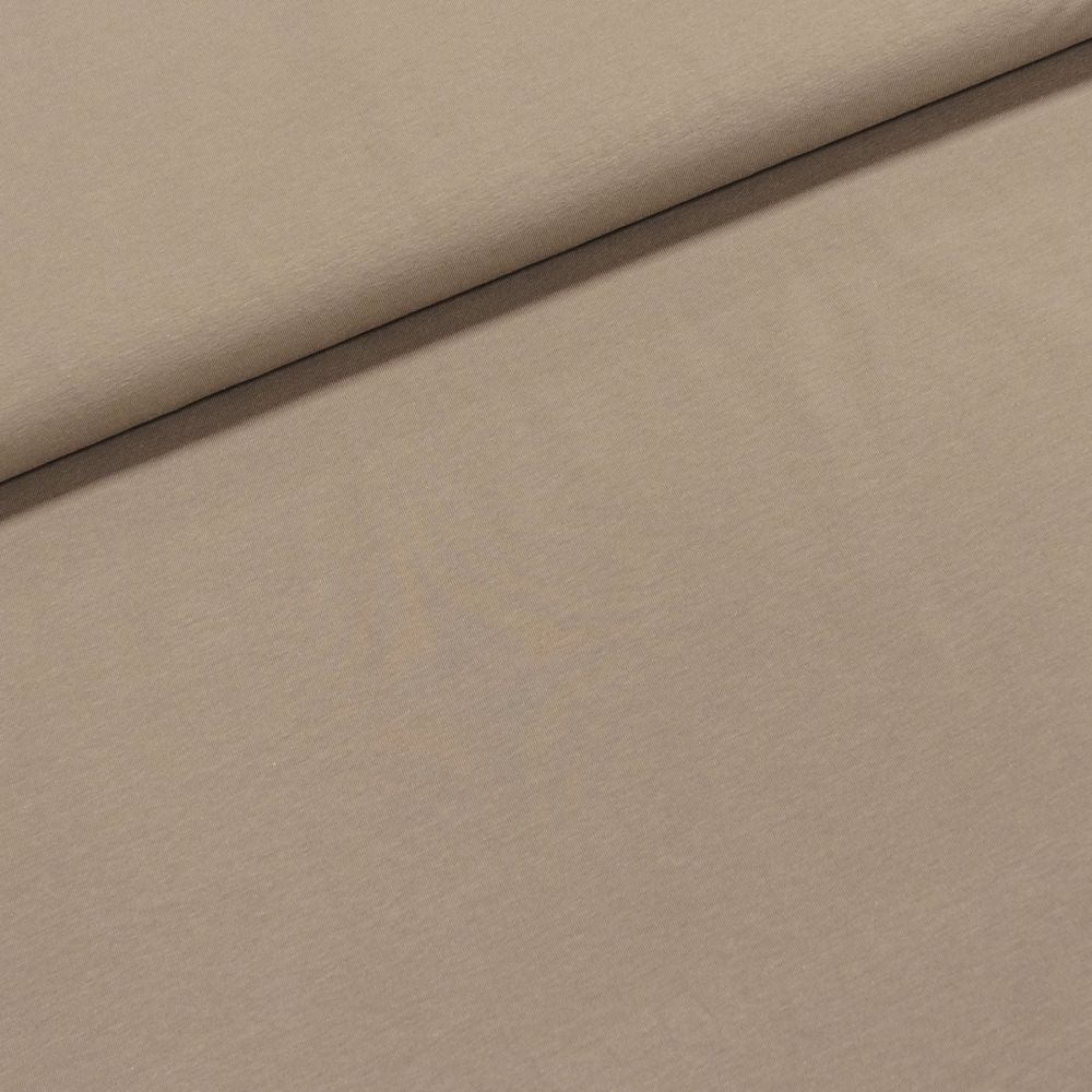 Elastický úplet (jersey) v jednobarevné tmavě béžové barvě, který je vhodný na trička, mikiny, elasťáky, šaty, sukně, kardigany. Látka je v šířce 180 cm, vyrobena z 95% bavlny a 5% elastanu (gramáž 200g/m2). Látka je oboustranná.