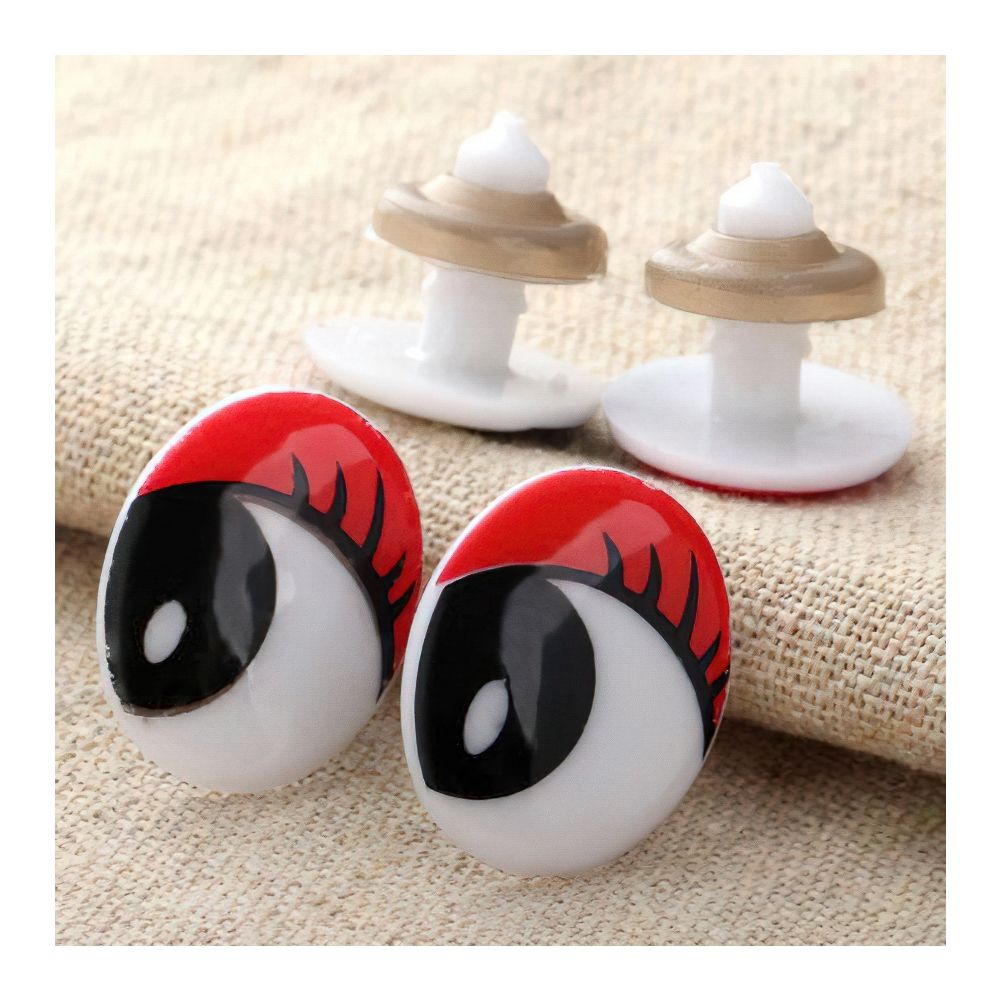 Bezpečnostní oči z tvrzeného plastu v rozměru 22x17mm s tištěným motivem očí, řas a obočí v červené barvě. Oči jsou vhodné pro výrobu hraček, dekorací a další doplňky. Díky bezpečnostní zarážce proti vypadnutí jsou oči odolnější vůči vytrhnutí nebo sloupnutí z výrobku. Cena je za 1ks včetně zarážky. Objednávat lze pouze jako pár (2ks).