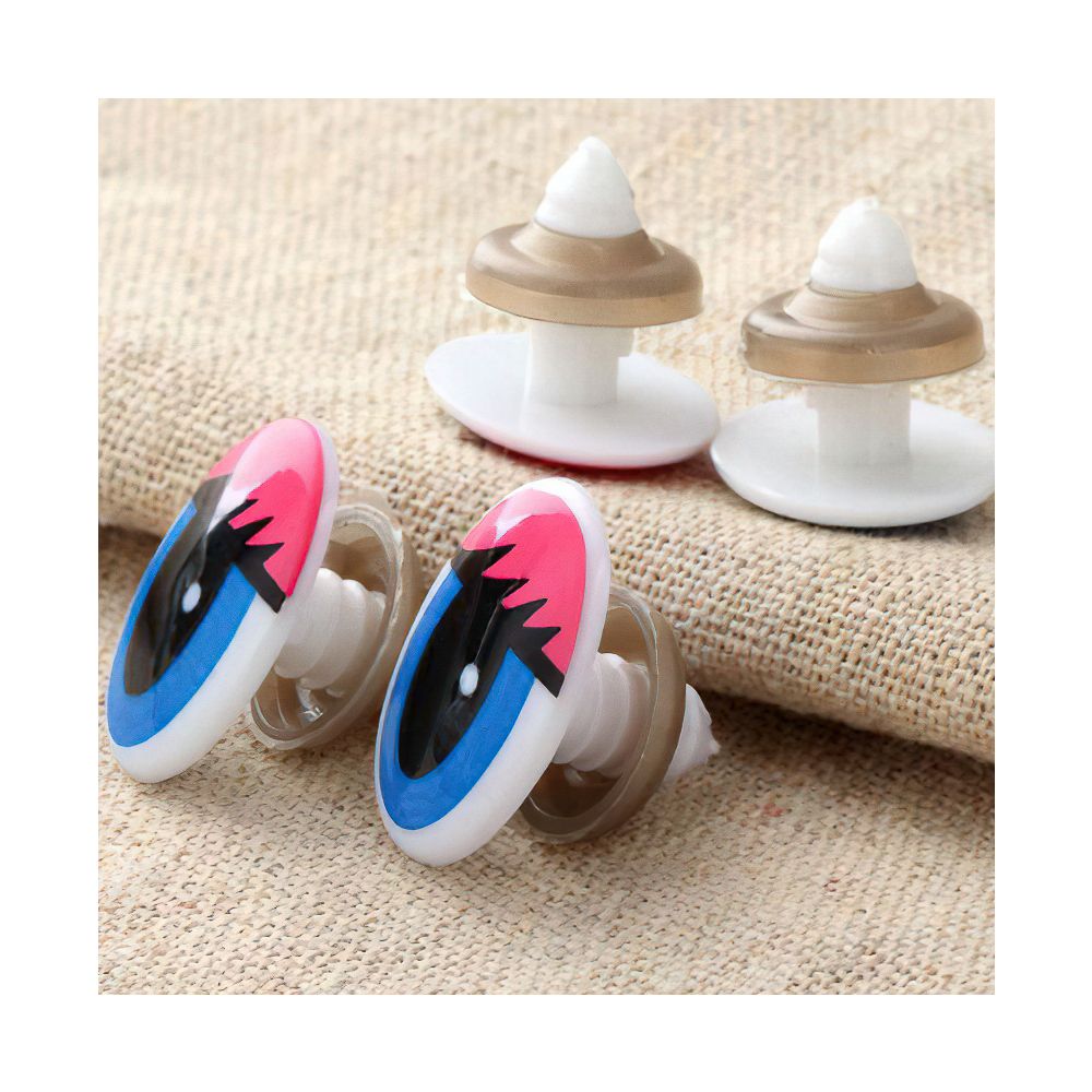 Bezpečnostní oči z tvrzeného plastu v rozměru 21x15mm s tištěným motivem modrých očí, řas a obočí v růžové barvě. Oči jsou vhodné pro výrobu hraček, dekorací a další doplňky. Díky bezpečnostní zarážce proti vypadnutí jsou oči odolnější vůči vytrhnutí nebo sloupnutí z výrobku. Cena je za 1ks včetně zarážky. Objednávat lze pouze jako pár (2ks).