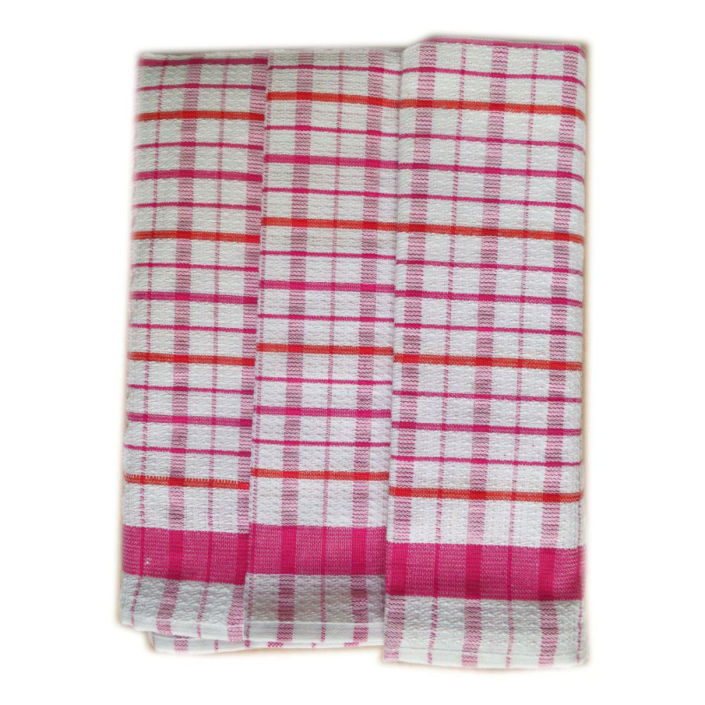 Souprava tří kusů kuchyňských utěrek z exkluzivní egyptské bavlny v rozměru 50x70cm v bílé barvě s motivem kára s růžovými a červenými proužky.