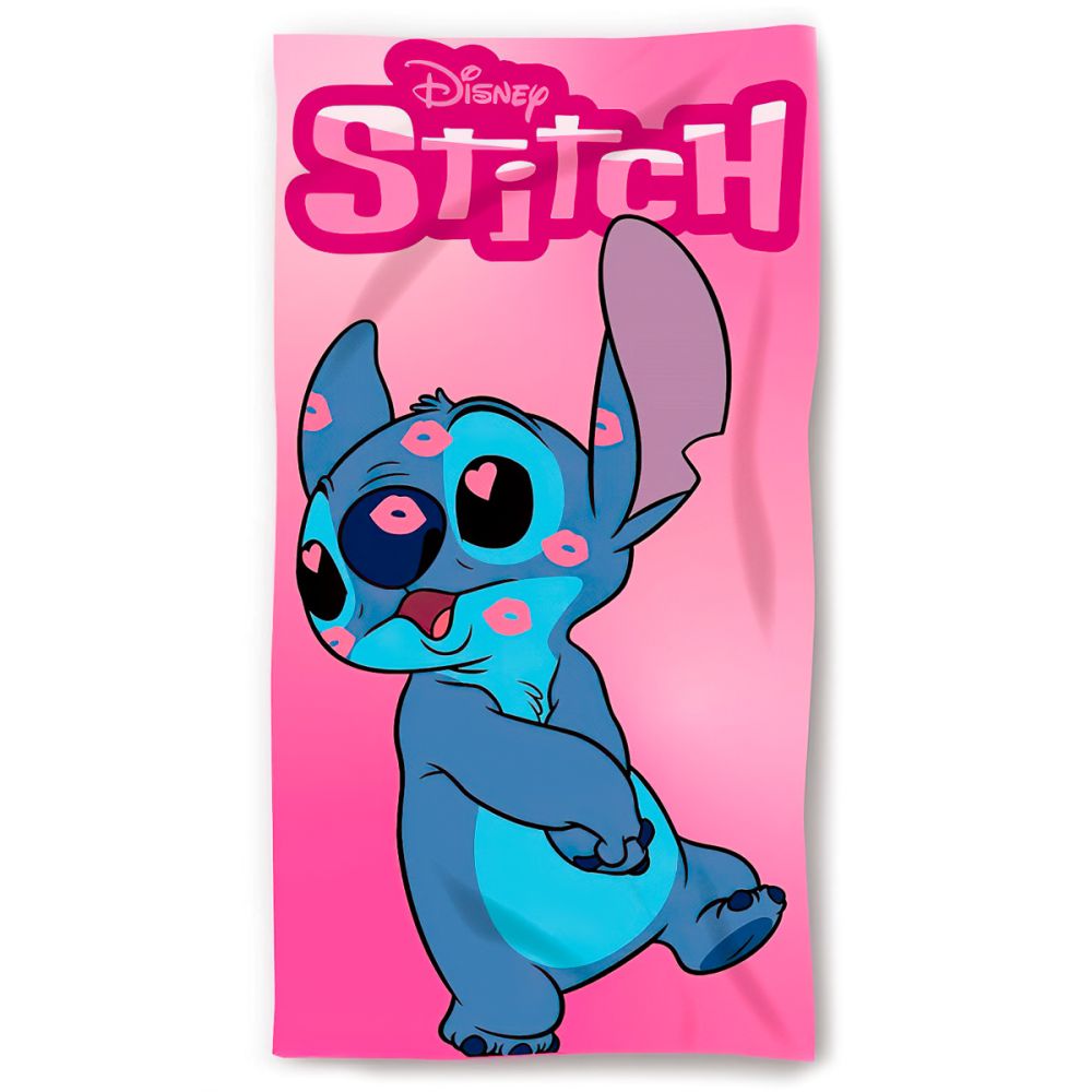 Dětská plážová osuška s motivem malého pejska Stitche z animované komedie Lilo a Stitch na růžovém pozadí. Osuška je z lícové strany s potiskem, z rubu má jemné froté smyčky bez potisku. Osuška je vyrobena ze 100% bavlny s gramáží 320g/m2.
