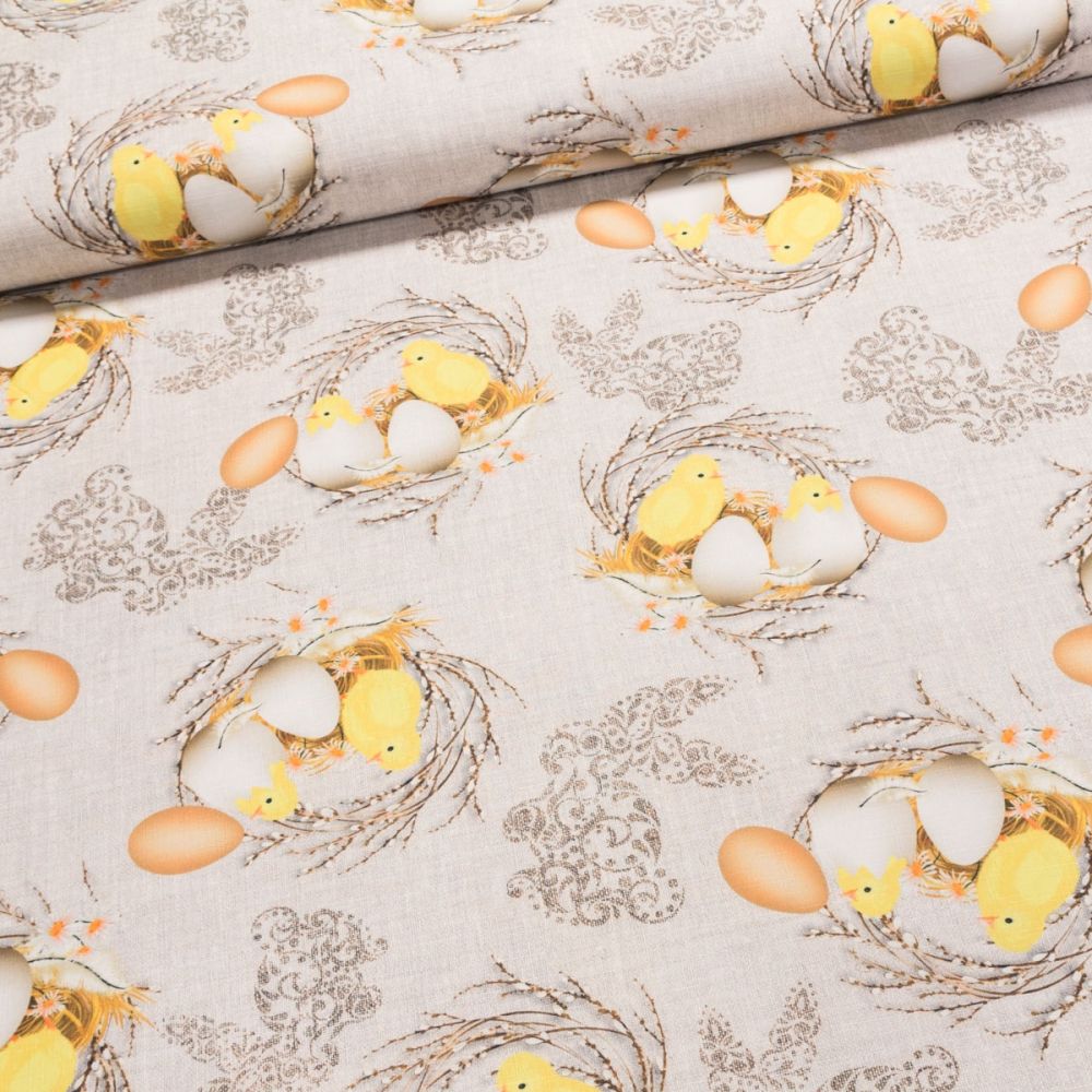 Polyesterová látka (tkanina) s teflonovou úpravou s velikonočním motivem kuřátek s vajíčky na béžovém podkladu. Látka je v šířce 160 cm a je vyrobena ze 100% polyesteru s teflonovou vrstvou, vzor je plastický z toho důvodu látku žehlit z rubové strany. Motiv na látce je pouze z jedné strany, z druhé je látka bez potisku.