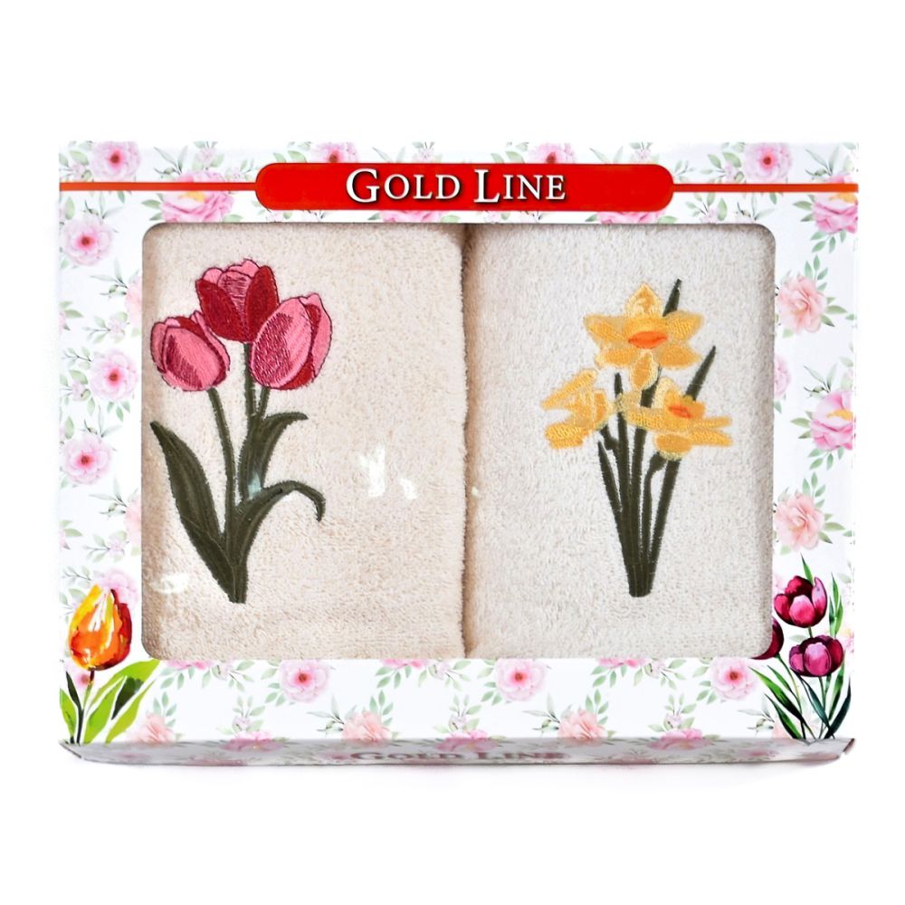 Dárkový set dvou kusů froté ručníků (50x100cm) se vzorem narcisek a tulipánů na smetanovém podkladu. Ručníky jsou vyrobeny z vysoce kvalitní 100% bavlny s vysokou gramáží, díky čemuž jsou velmi hebké, savé a mají nadýchaný vzhled. Vyrobeny jsou v gramáži 450g/m2. Dodáváno v dárkovém, krabicovém balení.