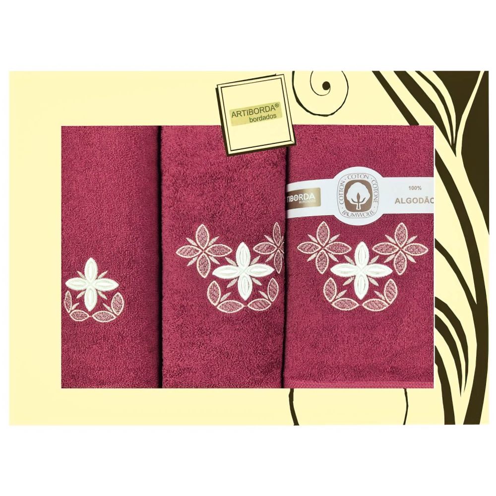 Dárkový set froté ručníků (1x 30x50cm, 1x 50x90cm) a osušek (1x 70x140cm) v bordó s vyšívanými květinami. Ručníky jsou vyrobeny z vysoce kvalitní 100% bavlny s vysokou gramáží, díky čemuž jsou velmi hebké, savé a mají nadýchaný vzhled. Vyrobeny jsou v gramáži 450g/m2. Dodáváno v dárkovém, krabicovém balení.