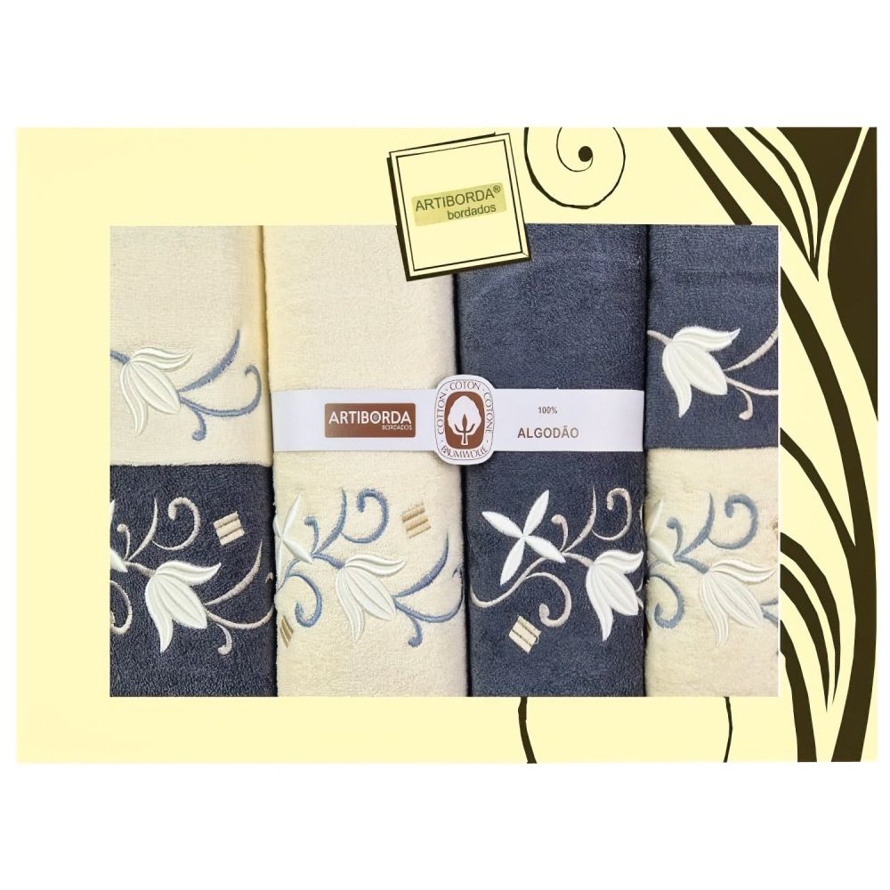 Dárkový set froté ručníků (2x 30x50cm, 2x 50x90cm) a osušek (2x 70x140cm) s vyšívanými květy na krémovém a grafit (šedém) podkladu. Ručníky jsou vyrobeny z vysoce kvalitní 100% bavlny s vysokou gramáží, díky čemuž jsou velmi hebké, savé a mají nadýchaný vzhled. Vyrobeny jsou v gramáži 450g/m2. Dodáváno v dárkovém, krabicovém balení.