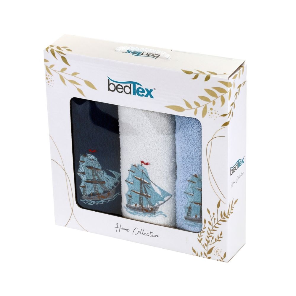 Dárkový set froté ručníků (3x 30x50cm) s vyšívaným vzorem lodí na bílém, tmavě modrém a modrém pozadí. Ručníky jsou vyrobeny z vysoce kvalitní 100% bavlny s vysokou gramáží, díky čemuž jsou velmi hebké, savé a mají nadýchaný vzhled. Vyrobeny jsou v gramáži 400g/m2 vhodné k umyvadlu jak do koupelny, WC nebo také do kuchyně. Dodáváno v dárkovém, krabicovém balení.