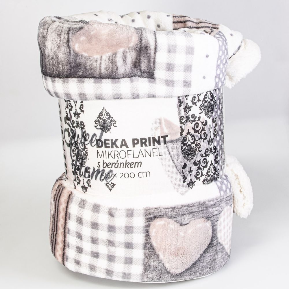 Deka z mikrovlákna (100% polyesterové mikrovlákno) z jedné strany smetanová barva v úpravě imitace ovčí vlny neboli beránek z druhé strany béžovo-šedý vzor se srdíčky a nápisy home mikrovlákno (mikroflanel). Deka je v rozměru na jednolůžko 150 x 200 cm.