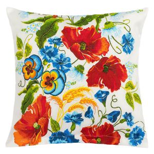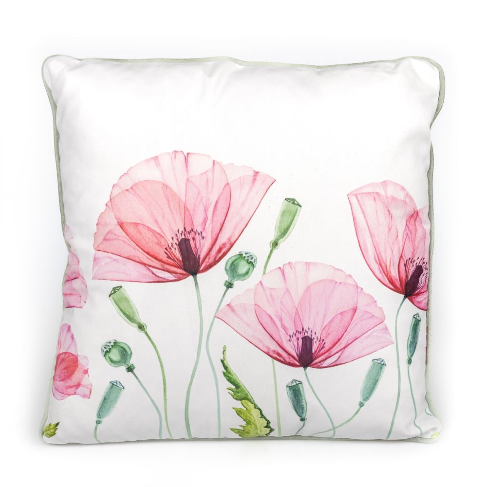 Dekorační polštářek s motivem růžových vlčích máků na bílém podkladu. Polštářek má vzor jen z jedné strany. Povlak na polštářek je vyroben ze 100% polyesteru a výplň je tvořena ze 100% Polyesteru (kuličky z dutého vlákna). Vnitřní výplň je možné vyjmout a prát povlak samostatně.