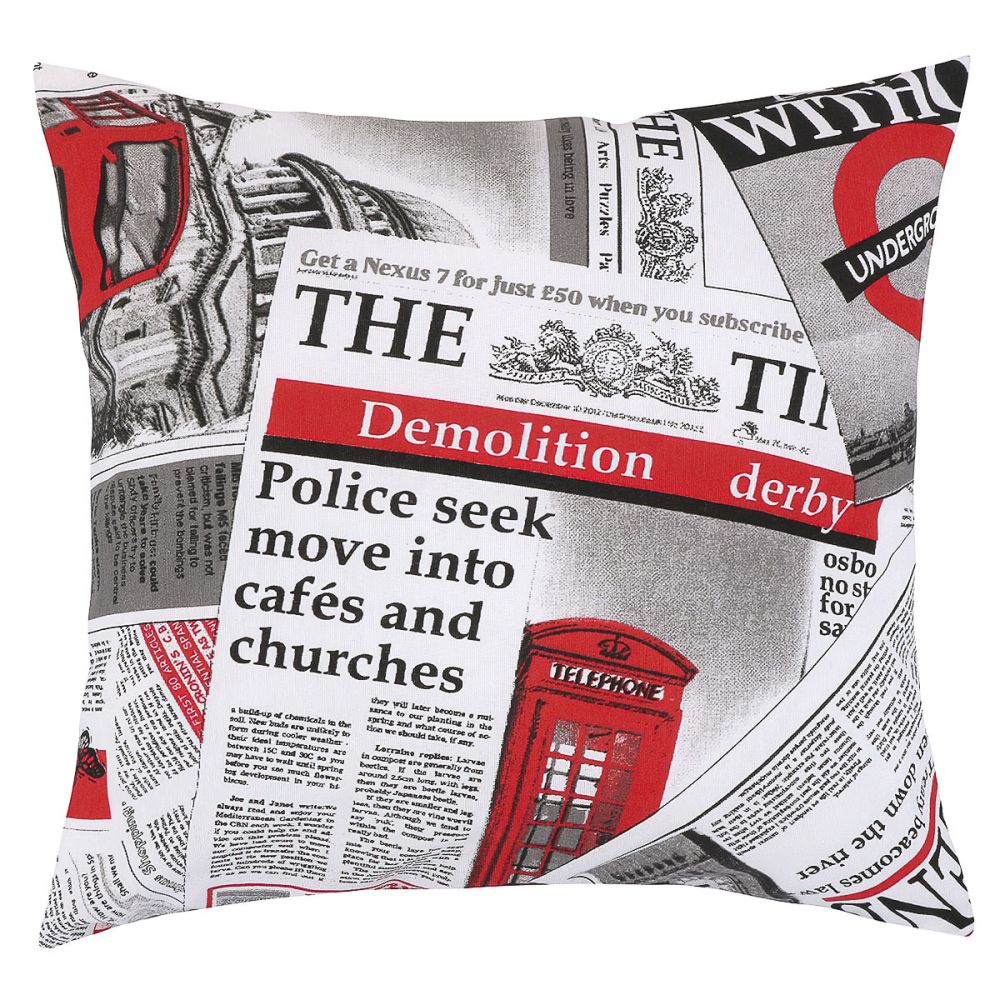 Dekorační polštářek s motivem novin s červenými obrázky na bílo-šedém podkladu. Polštářek je z obou stran stejný. Povlak na polštářek je vyroben ze 70% bavlny a 30% polyesteru a výplň je tvořena ze 100% Polyesteru (kuličky z dutého vlákna). Vnitřní výplň je možné vyjmout a prát povlak samostatně.