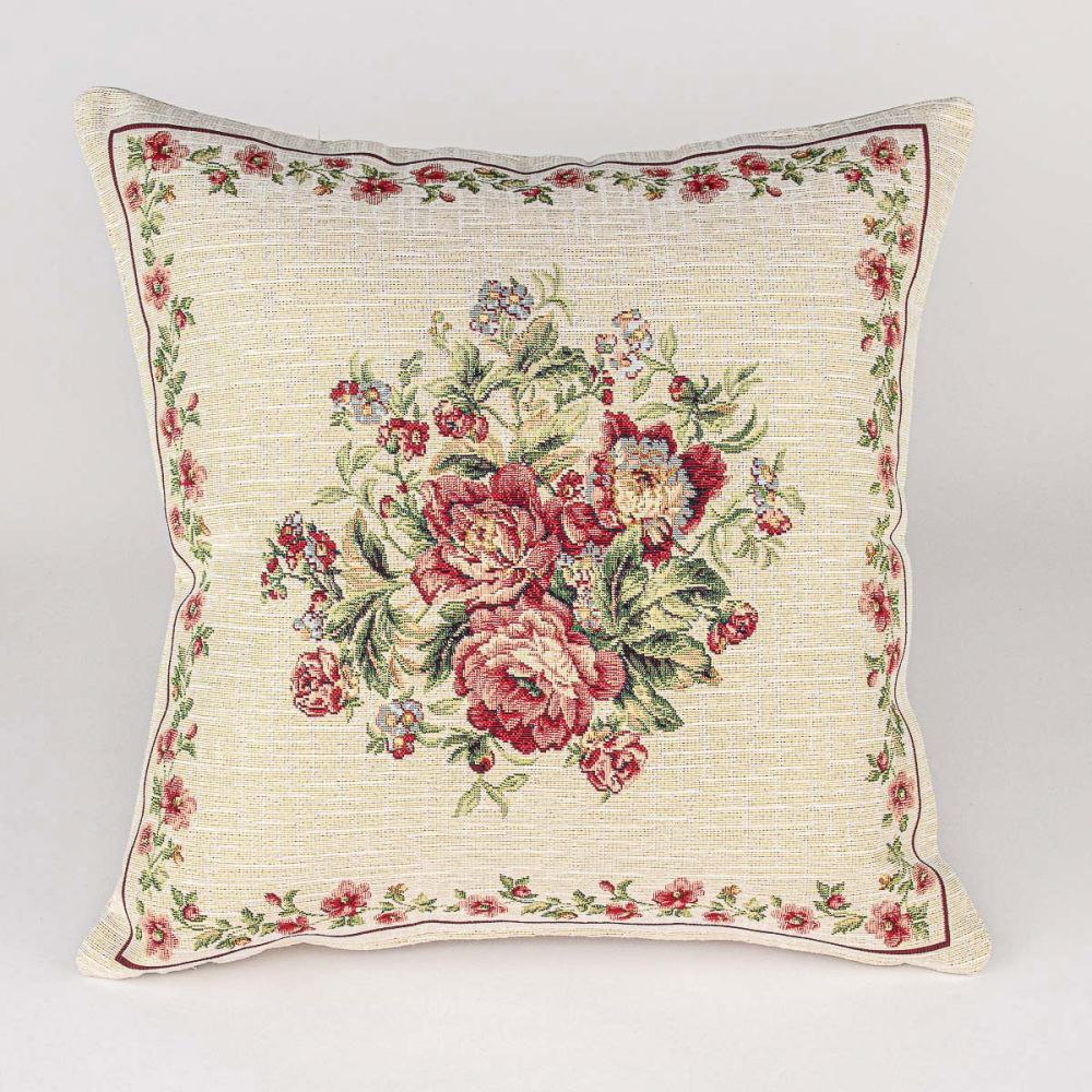 Dekorační povlak na polštářek v retro provedení z hustě tkané látky (gobelín) s vysokou gramáží s motivem kytice růží na smetanovém podkladu lemované malými růžičkami v rozměru 45 x 45 cm. Vzor na povlaku je oboustranný. Povlak na polštářek je vyroben ze 70% polyesteru a 30% bavlny. Zapínání na ZIP. Povlak je možné objednat samostatně bez výplně, s levnější dekorační výplní nebo luxusnější výplní na spaní.