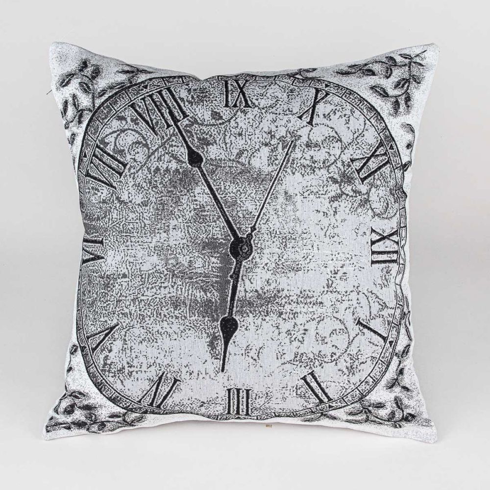 Dekorační povlak na polštářek v retro provedení z hustě tkané látky (gobelín) s vysokou gramáží s motivem hodin v šedých barvách v rozměru 45 x 45 cm. Vzor na povlaku je oboustranný. Povlak na polštářek je vyroben ze 70% polyesteru a 30% bavlny. Zapínání na ZIP. Povlak je možné objednat samostatně bez výplně, s levnější dekorační výplní nebo luxusnější výplní na spaní.