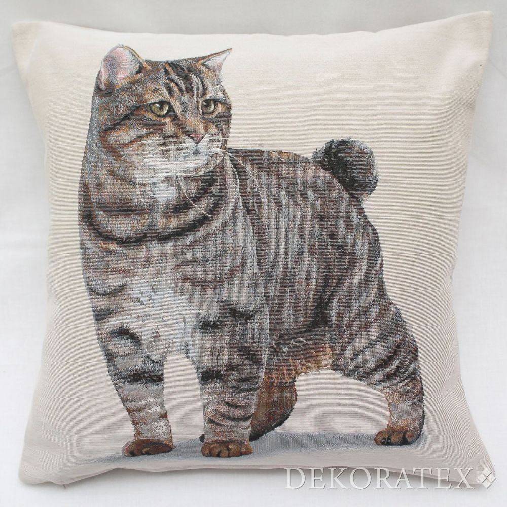 Dekorační povlak na polštářek v retro provedení z hustě tkané látky (gobelín) s vysokou gramáží s motivem šedé kočky na režném podkladu v rozměru 45 x 45 cm. Vzor na povlaku je oboustranný. Povlak na polštářek je vyroben ze 70% polyesteru a 30% bavlny. Zapínání na ZIP. Povlak je možné objednat samostatně bez výplně, s levnější dekorační výplní nebo luxusnější výplní na spaní.
