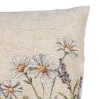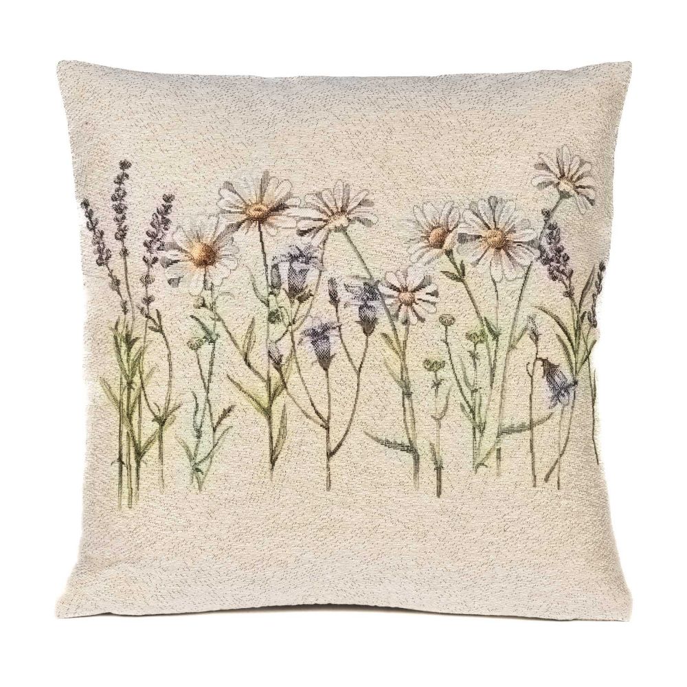 Dekorační povlak na polštářek v retro provedení z hustě tkané látky (gobelín) s vysokou gramáží se vzorem kopretina levandule na béžovém podkladu v rozměru 45 x 45 cm. Vzor na povlaku je oboustranný. Povlak na polštářek je vyroben ze 70% polyesteru a 30% bavlny. Zapínání na ZIP. Povlak je možné objednat samostatně bez výplně, s levnější dekorační výplní nebo luxusnější výplní na spaní.