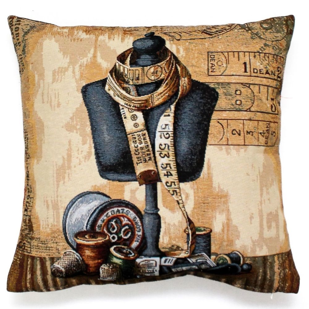 Dekorační povlak na polštářek v retro provedení z hustě tkané látky (gobelín) s vysokou gramáží se vzorem krejčovské panny a šicích potřeb v rozměru 45 x 45 cm. Vzor na povlaku je oboustranný. Povlak na polštářek je vyroben ze 70% polyesteru a 30% bavlny. Zapínání na ZIP. Povlak je možné objednat samostatně bez výplně, s levnější dekorační výplní nebo luxusnější výplní na spaní.
