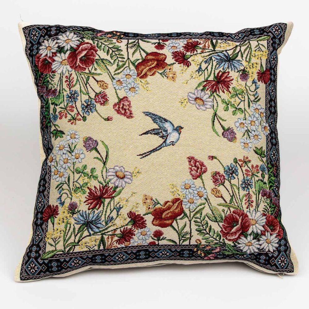 Dekorační povlak na polštářek v retro provedení z hustě tkané látky (gobelín) s vysokou gramáží se vzorem květiny s vlaštovkou v modrém rámečku v rozměru 45 x 45 cm. Vzor na povlaku je oboustranný. Povlak na polštářek je vyroben ze 70% polyesteru a 30% bavlny. Zapínání na ZIP. Povlak je možné objednat samostatně bez výplně, s levnější dekorační výplní nebo luxusnější výplní na spaní.