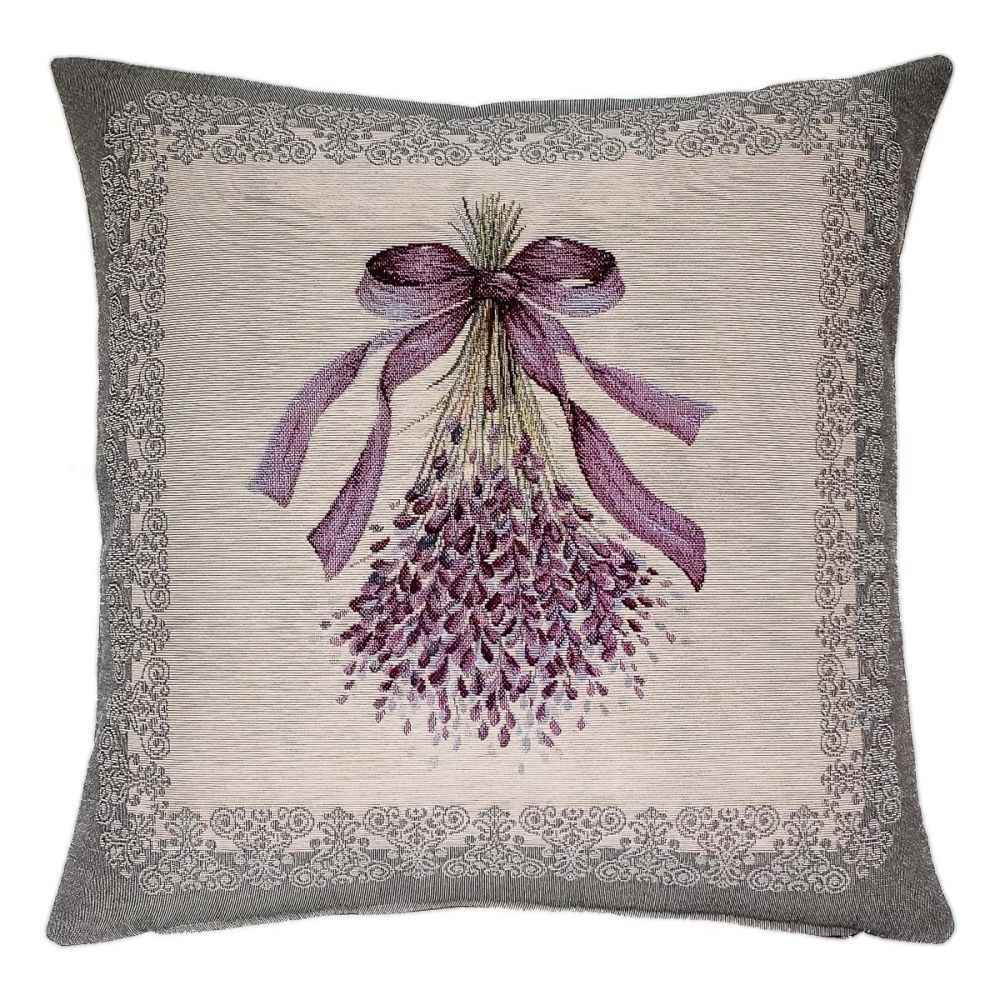 Dekorační povlak na polštářek v retro provedení z hustě tkané látky (gobelín) s vysokou gramáží se vzorem sušené levandule svázané fialovou mašlí s šedým ozdobným rámečkem v rozměru 45 x 45 cm. Vzor na povlaku je oboustranný. Povlak na polštářek je vyroben ze 70% polyesteru a 30% bavlny. Zapínání na ZIP. Povlak je možné objednat samostatně bez výplně, s levnější dekorační výplní nebo luxusnější výplní na spaní.