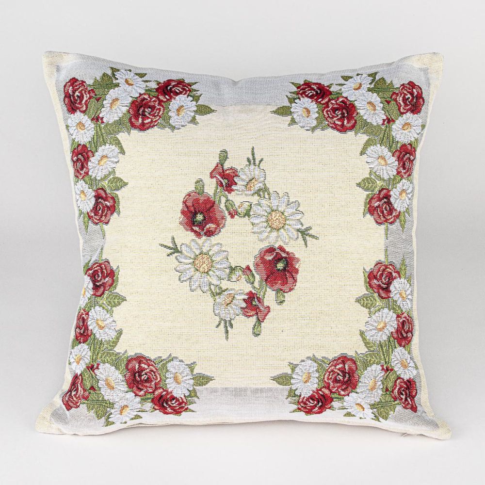 Dekorační povlak na polštářek v retro provedení z hustě tkané látky (gobelín) s vysokou gramáží s motivem růží a kopretin na smetanovém podkladu v rozměru 45 x 45 cm. Vzor na povlaku je oboustranný. Povlak na polštářek je vyroben ze 70% polyesteru a 30% bavlny. Zapínání na ZIP. Povlak je možné objednat samostatně bez výplně, s levnější dekorační výplní nebo luxusnější výplní na spaní.