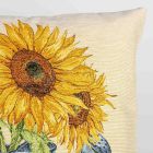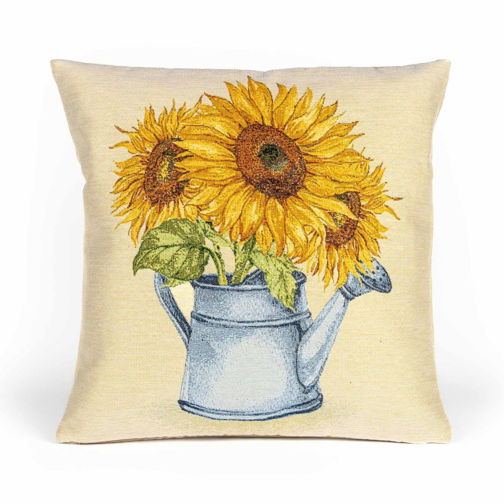 Dekorační povlak na polštářek v retro provedení z hustě tkané látky (gobelín) s vysokou gramáží se vzorem slunečnic v modré konvičce na béžovém podkladu v rozměru 45 x 45 cm. Vzor na povlaku je oboustranný. Povlak na polštářek je vyroben ze 70% polyesteru a 30% bavlny. Zapínání na ZIP. Povlak je možné objednat samostatně bez výplně, s levnější dekorační výplní nebo luxusnější výplní na spaní.