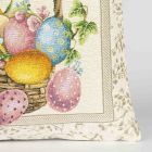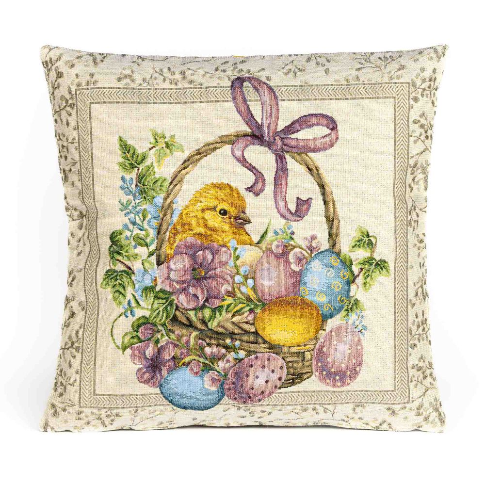 Dekorační povlak na polštářek v retro provedení z hustě tkané látky (gobelín) s vysokou gramáží se vzorem velikonočních vajíček s kuřátkem v růžových a modrých barvách s ozdobným béžovým rámečkem v rozměru 45 x 45 cm. Vzor na povlaku je oboustranný. Povlak na polštářek je vyroben ze 70% polyesteru a 30% bavlny. Zapínání na ZIP. Povlak je možné objednat samostatně bez výplně, s levnější dekorační výplní nebo luxusnější výplní na spaní.